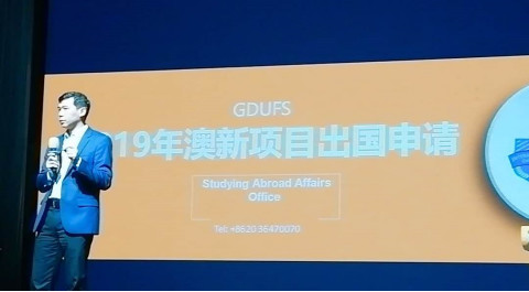 In the afternoon of December 20th, the Campus Talk on Application for Exchange Programs in Australia and New Zealand for students enrolled in 2017 was held in the B8 Lecture Hall in the Higher Education Mega Center. The Deputy Director of Office of International Affairs Zhong Risheng, the Deputy Director of the Exchange Office of the International Division Yang Xinhui, and Elsie Wong from Queensland University of Technology, and Tan Yingying from the Service Center of Overseas Studies of GDUFS were invited to give lectures. Among participants, there were counsellors Huang Guanfu and Liu Xiaojuan, and 200 sophomores who were in the Australia-New Zealand Exchange Programs. The talk was moderated by Mr. Cai Chunliu from the Department ofOverseas Studies Affairs.