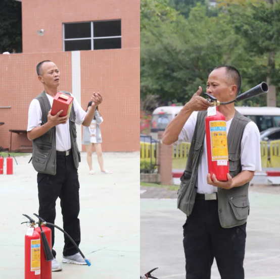Mr. Yang Riguang from the security office introduced to the students two kinds of commonly used fire extinguishers and the way to use a gas mask and the precautions when using them.
